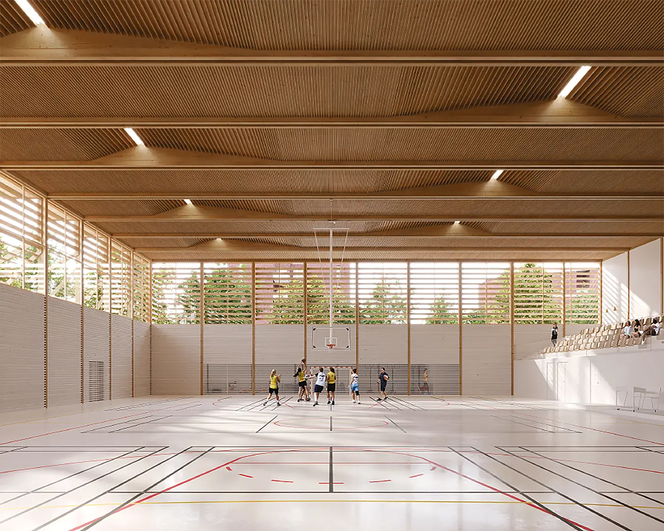 D’une surface totale de 5 000 m², ce complexe sportif accueillera associations et public scolaire dans un cadre moderne : salle de gymnastique, salle multisport, vestiaires, tribune de 250 places et parking souterrain de 70 places.